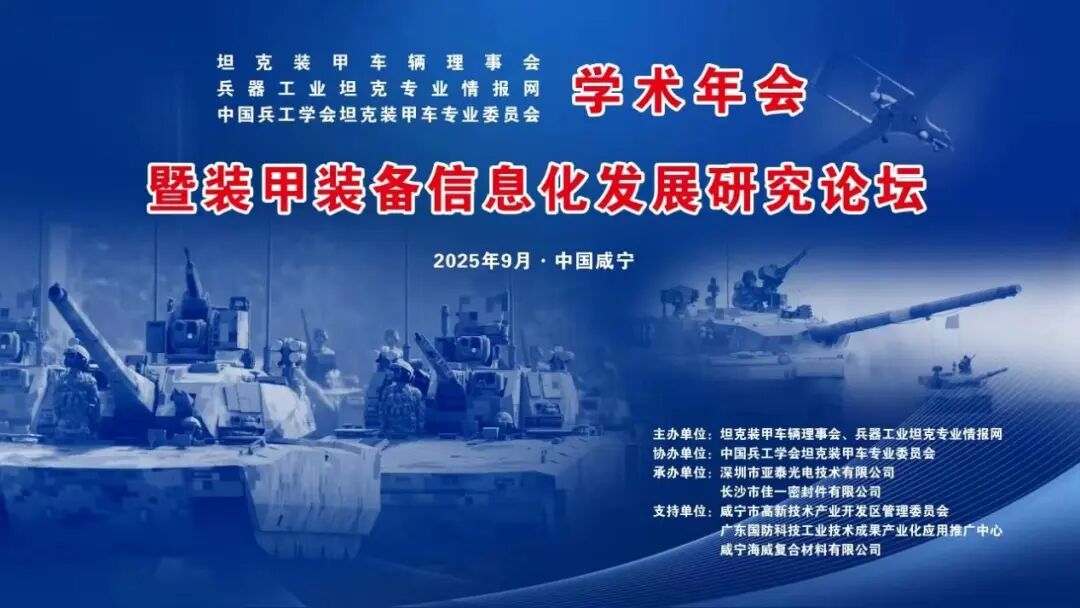 由坦克装甲车辆理事会、兵器工业坦克专业情报网主办,深圳市亚泰光电技术有限公司承办的"2025年坦克装甲车辆学术年会暨装甲装备信息化发展研究论坛"将于9月17日至19日在湖北咸宁华信大酒店隆重举行。本次会议以"装甲装备信息化发展"为主题,旨在深入探讨装甲装备信息化前沿技术,推动陆战装备智能化转型。