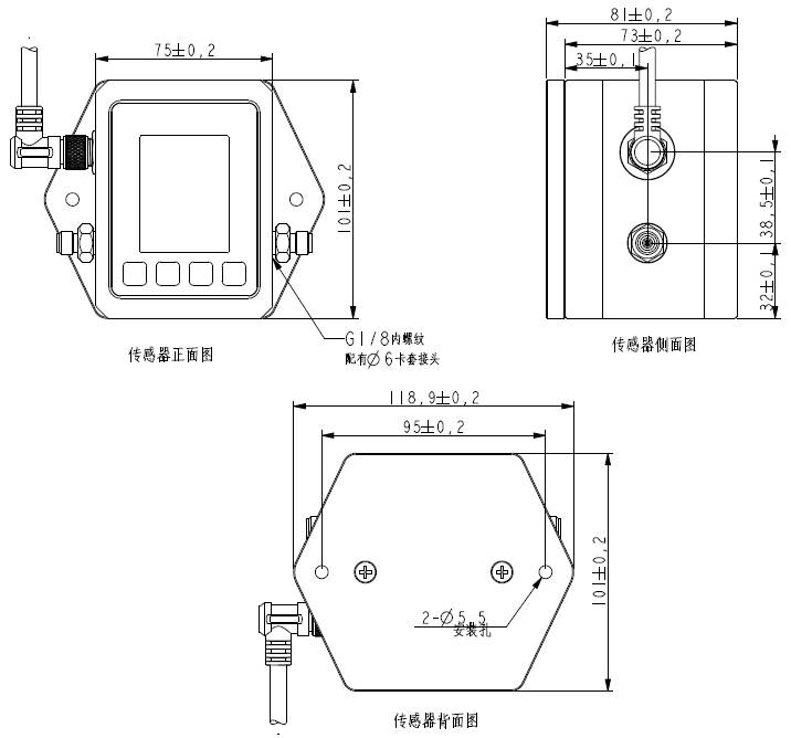 传感器机箱的外形以及安装孔尺寸图 单位:mm